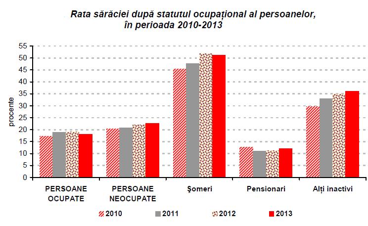 Riscul de saracie al persoanelor neocupate s-a accentual in perioada 2010-2013 la someri (5,7 puncte procentuale) si persoanele inactive (cu circa 2,2 puncte procentuale). Exceptie a inregistrat categoria pensionarilor, a caror risc de saracie in ultimul an a scazut usor pe total (cu 0,8 puncte procentuale), insa mai accentuat la femei (1,3 puncte procentuale). Marimea si structura gospodariilor in care traiesc persoanele sunt caracteristici aflate in legatura directa cu riscul de saracie, in sensul cresterii sau descresterii acestuia.