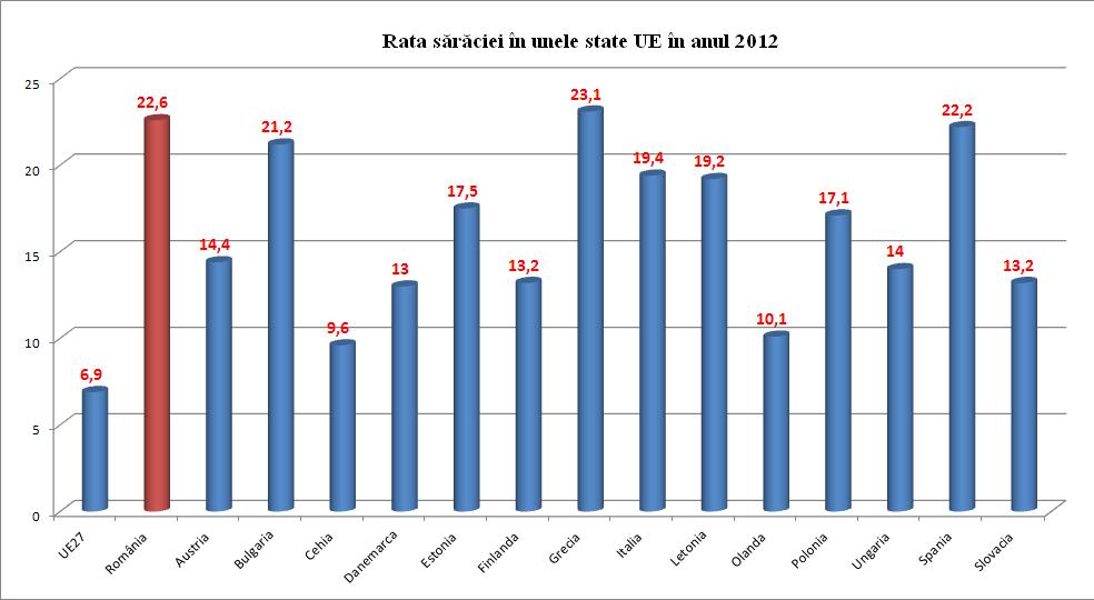 Romaniei traia intr-o familie ale carei venituri erau mai mici decat pragul stabilit la nivelul de 60% din mediana veniturilor disponibile. In perioada 2010-2013, rata saraciei s-a situat in jurul valorii de 22%, inregistrand un maxim in anul 2012 (22,6%) si un minim in anul 2010 (21,1%).