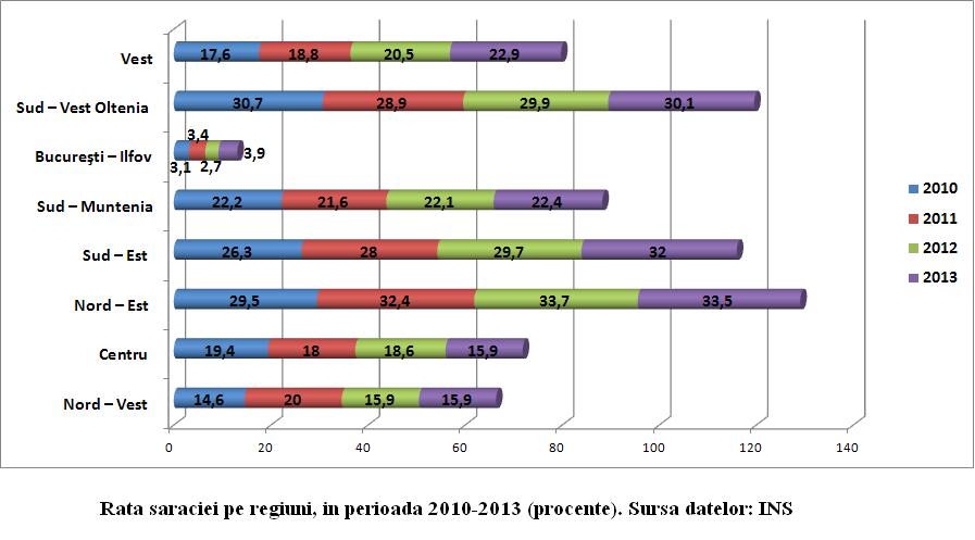 Saracia este inegal distribuita in tara. In anul 2013, rata saraciei a fost de aproape 9 ori mai mare in regiunea Moldovei si de aproape 8 ori in regiunile Dobrogei si Olteniei decat in regiunea Capitalei. Analiza evolutiei ratei saraciei in perioada 2010-2013 arata ca, fata de inceputul perioadei, cele mai mari cresteri ale ratei saraciei s-au intalnit in regiunile Sud-Est (5,7 puncte procentuale), Vest (5,3 puncte procentuale) si Nord-Est (4,0 puncte procentuale), pe cand scadere a ratei a avut loc in regiunea Centru (3,5 puncte procentuale) si, cu foarte putin, si in regiunea Sud-Vest Oltenia (0,6 puncte procentuale