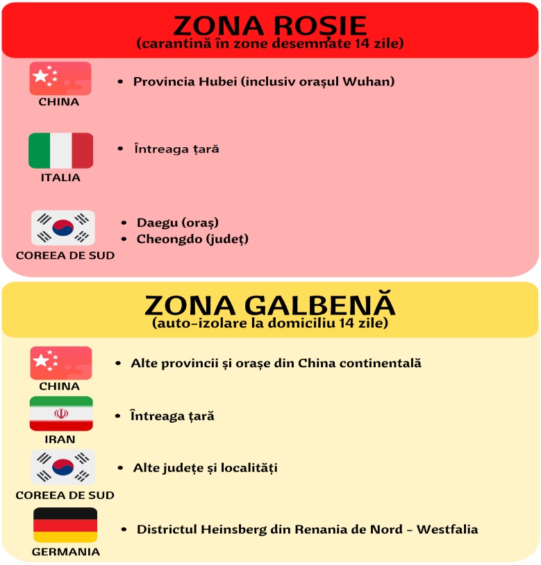 Zonele în funcție de care se instituie persoanelor sosite în România auto-izolarea la domiciliu sau carantina instituționalizată se regăsesc pe pagina de internet a Institutului Național de Sănătate Publică din România – www.cnscbt.ro.