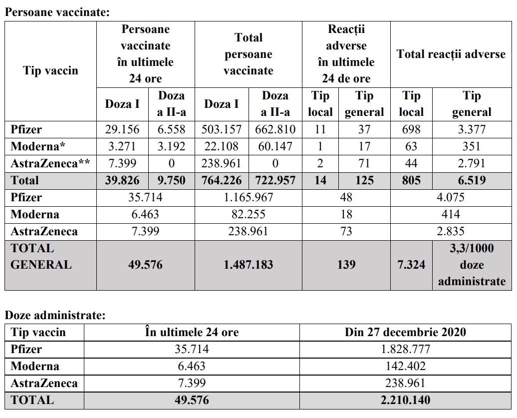 În ultimele 24 de ore s-au înregistrat 139 de reacții adverse – 48 la Pfizer, 18 la Moderna și 73 la AstraZeneca. De la debutul campaniei de vaccinare, numărul total al reacțiilor adverse a fost de 7.324 (3,3/1000 doze administrate). Alte 34 reacții adverse sunt în curs de investigare.