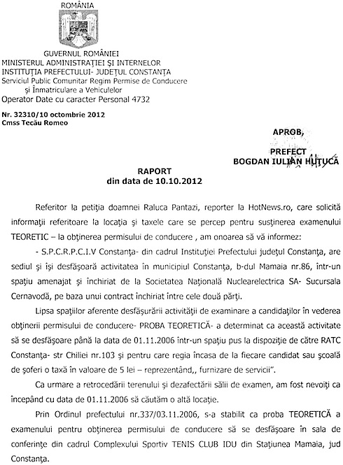 Raspunsul Prefecturii Constanta la solicitarea HotNews.ro este semnat de comisarul sef Romeo Tecau si aprobat de prefectul Bogdan Iulian Hutuca.
