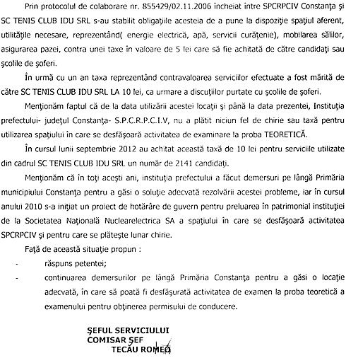 Mentionam faptul ca de la data utilizarii acestei locatii si pana la data prezentei, Institutia prefectului – judetul Constanta – S.P.C.R.P.C.I.V, nu a platit niciun fel de chirie sau taxa pentru utilizarea spatiului in care se desfasoara activitatea de examinare la proba TEORETICA.