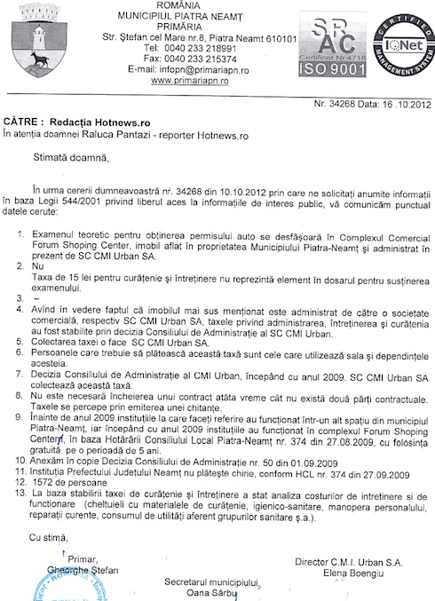 CITESTE RASPUNSUL INTEGRAL AL PRIMARIEI PIATRA NEAMT LA SOLICITAREA HOTNEWS.RO: