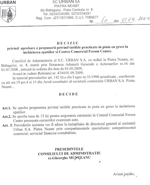 Primaria Piatra Neamt: Anexam in copie Decizia Consiliului de Administratie nr. 50 din 01.09.2009 (N.RED. – Copia mentionata a fost trimisa HotNews.ro pe 18 octombrie, la o data ulterioara transmiterii acestor raspunsuri. Vezi mai jos Decizia Consiliului de Administratie)