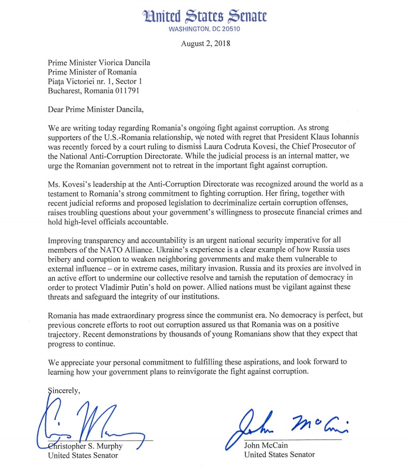 Senatorii americani John McCain şi Christopher Murphy i-au adresat joia trecută o scrisoare prim-ministrului României, Viorica Dăncilă, exprimându-şi îngrijorarea faţă de demiterea procurorului-şef al DNA şi cerând guvernului de la Bucureşti să continue progresele în combaterea corupţiei, informează Agerpres.
