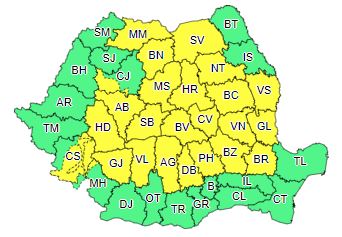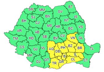 Potrivit celui de-al doilea cod galben, valabil până marți, ora 06.00, în Muntenia și în sud-vestul Moldovei vor fi perioade cu instabilitate atmosferică accentuată ce se va manifesta prin averse cu caracter torențial, frecvente descărcări electrice, intensificări de scurtă durată ale vântului, vijelii și pe arii restrânse grindină. În intervale scurte de timp sau prin acumulare, cantitățile de apă vor depăși 20…25 l/mp și izolat 40 l/mp.