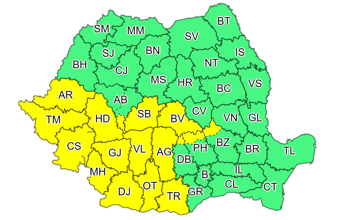 Administrația Națională de Meteorologie a emis două coduri galbene în care avertizează că, începând de luni seară, în treimea de sud-vest a țării se vor consemna ploi însemnate cantitativ și intensificări ale vântului, acestea extinzându-se în aproape toată țara începând cu marți dimineață.
