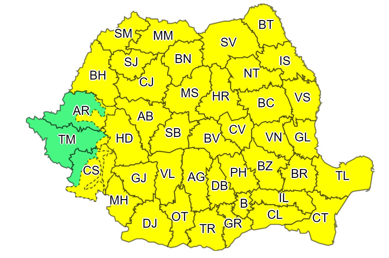 Primul cod galben este valabil de luni, ora 21.00, până marți, ora 09.00: