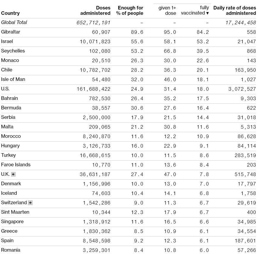 Din punct de vedere al procentului din populație cu imunizare completă cu două doze, pe primul loc se află micuțul teritoriu britanic Gibraltar – 85%, urmat de Israel – 53,2% și Seychelles – 39,5%.