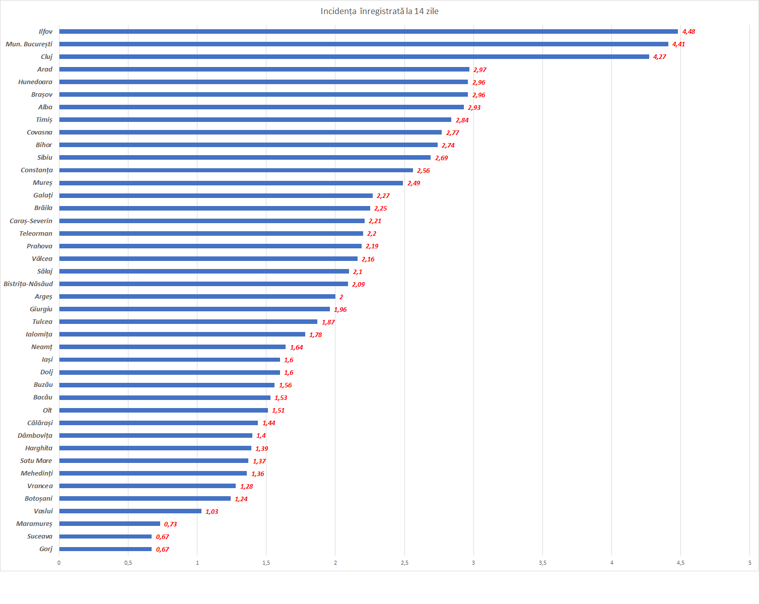 Incidența cazurilor de coronavirus a scăzut miercuri la 4,41 în București, iar media națională a coborât de la 2,74 la 2,09, potrivit datelor oficiale furnizate de Grupul de Comunicare Strategică. Numărul județelor aflate în zona roșie a scăzut de la patru la trei, Ilfov, București și Cluj coborând sub pragul de 3 cazuri la mie în ultimele 14 zile. Cea mai mare rată de infectare rămâne în Ilfov – 4,48, dar în scădere.