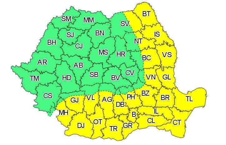 De duminică, de la ora 15.00, și până luni, la ora 6.00, unsprezece județe vor fi sub avertizare cod galben de instabilitate atmosferică. Judeţele vizate sunt: Suceava, Botoşani, Timiş, Caraş-Severin, Gorj, Mehedinţi şi Dolj, iar parţial, Maramureş, Bistriţa-Năsăud, Mureş şi Harghita.