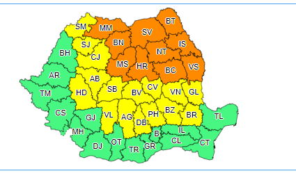 Judeţele vizate de Cod galben sunt: Satu Mare, Sălaj, Cluj, Alba, Hunedoara, Sibiu, Vâlcea, Braşov, Argeş, Covasna, Prahova, Dâmboviţa, Vrancea, Buzău Brăila şi Galaţi.