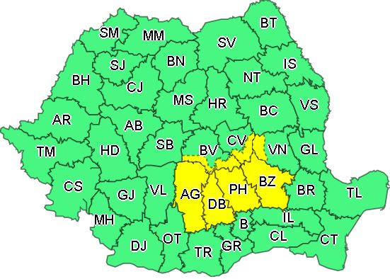 Administrația Națională de Meteorologie a emis și o avertizare cod galben de instabilitate atmosferică temporar accentuată, care va fi în vigoare joi, în intervalul 13.00 – 23.00.