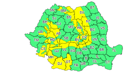 De asemenea, până joi, la ora 10.00, 27 de judeţe sunt sub avertizare cod galben de vânt puternic.