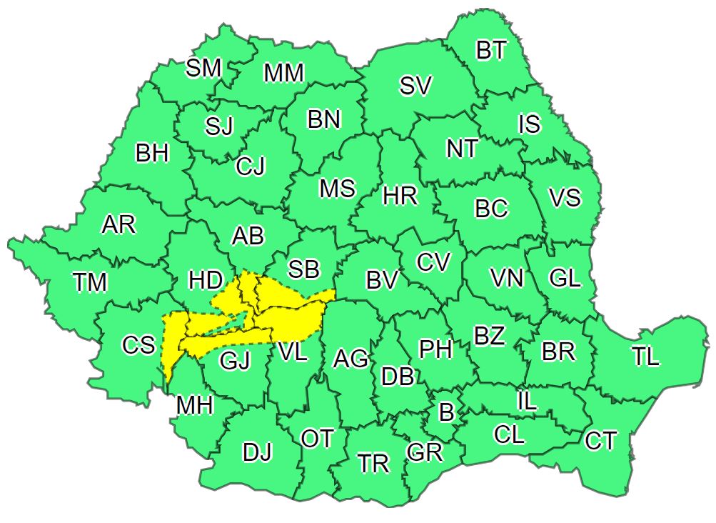 Codul galben atenționează că, local în Carpații Meridionali, la altitudini de peste 1700 m va ninge, se va depune strat de zăpadă, iar vântul va avea intensificări cu viteze ce vor depăși la rafală 70…80 km/h, viscolind ninsoarea și spulberând zăpada.