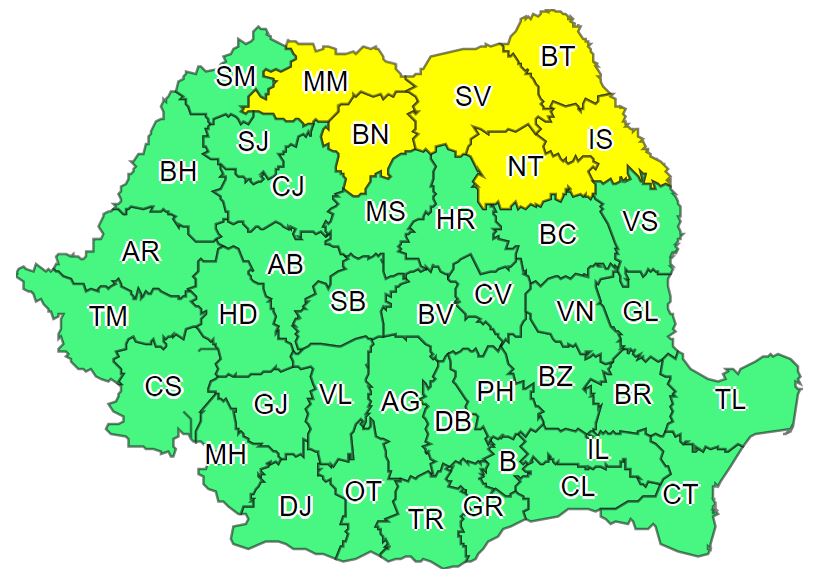Administrația Națională de Meteorologie a emis un cod galben de instabilitate atmosferică temporar accentuată, valabil sâmbătă, între orele 15.00 și 22.00 în șase județe .