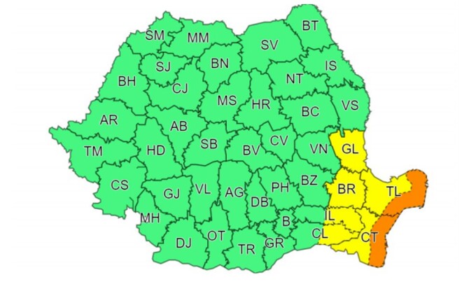 Avertizarea cod portocaliu este în vigoare între 10.00 – 15.00, în zona de litoral a judeţelor Constanţa şi Tulcea. Vor fi averse torenţiale, iar, mai ales prin acumulare, se vor înregistra cantităţi de apă de 40…60 l/mp.