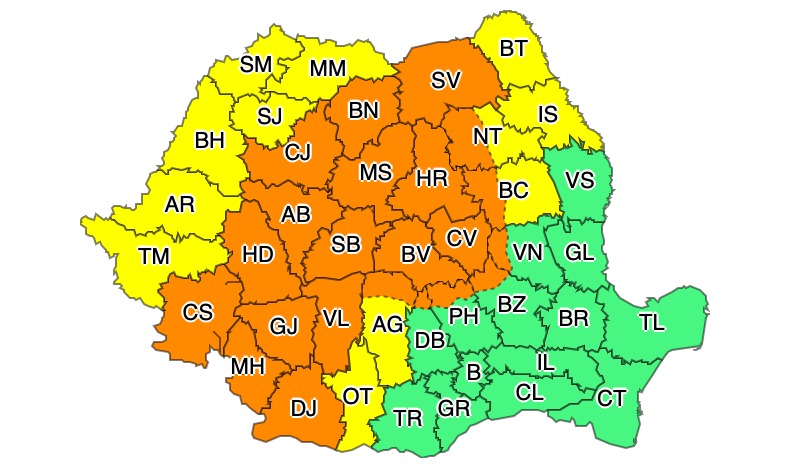 Conform Administrației Naționale de Meteorologie, în Banat, Crișana, Maramureș, Transilvania, Oltenia, în jumătatea de nord a Moldovei, nord-vestul Munteniei, precum și la munte vor fi perioade cu averse, descărcări electrice, intensificări de scurtă durată ale vântului, vijelii și grindină. În intervale scurte de timp cantitățile de apă vor fi de 20…25 l/mp și izolat peste 40 l/mp.