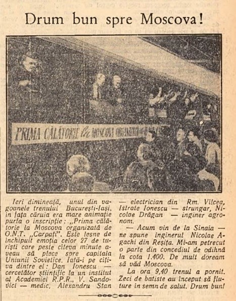 Ulterior, autorităţile române au publicat în scop propagandistic, tot pe prima pagină a ziarului „Scînteia”, un scurt articol privind plecarea la Moscova a primilor 27 de turişti români, însoţit de o fotografie (Gara de Nord, 27 septembrie 1955, ora 09.40). Printre excursionişti erau inginerul reşiţean Nicolae Agachi, „Dan Ionescu – cercetător ştiinţific la un institut al Academiei R.P.R., V. Sandovici – medic, Alexandru Stan – electrician din Rm. Vîlcea, Istrate Ionescu – strungar, Nicolae Drăgan – inginer agronom”.